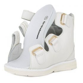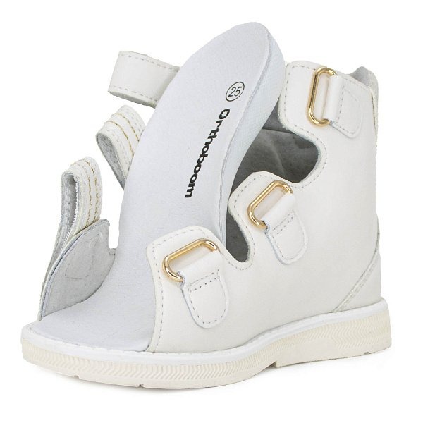 Обувь с двухсторонним высоким берцем, изготовленным с освобождением ахиллова сухожилия. Высокий жесткий берц фиксирует не только таранно-пяточный, но и голеностопный сустав, что при постоянном ношении этой обуви формирует правильное развитие суставных поверхностей и препятствует дальнейшему развитию деформации. Использование при этом съёмной сводоподдерживающей ортопедической стельки с углублением для размещения пятки позволяет правильно сформировать свод стопы.