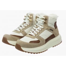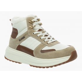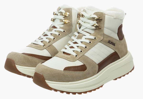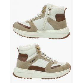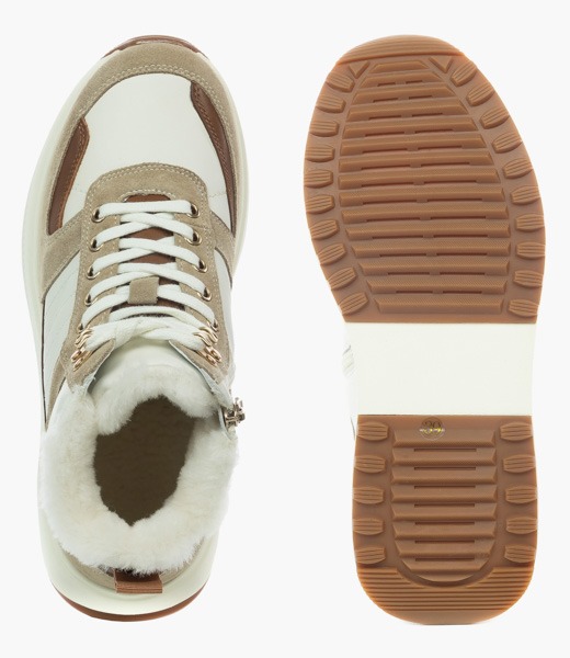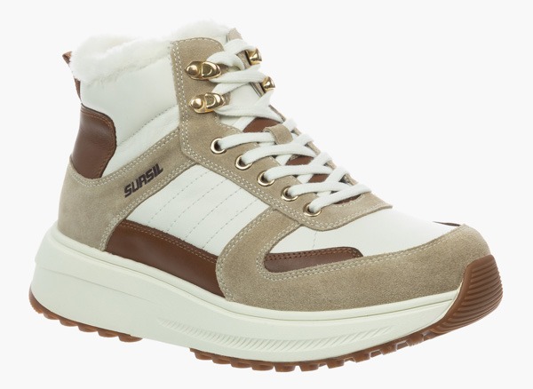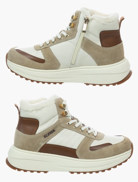 Высокие ортопедические женские зимние кроссовки в ярком дизайне - идеальный выбор для холодного времени года! Верх из натуральной кожи белого цвета в сочетании с нубуком светлых и темных оттенков бежевого, дополненный сивочно белой подошвой с каучуковым протектором - образец актуального стиля в сочетании с комфортом. Белая шерстяная подкладка и покрытие стельки обеспечат ногам тепло при минусовых температурах.Застежка на молнии с внутренней стороны в дополнение к шнуровке значительно повышает удобство надевания.Анатомическая стелька с выраженной поддержкой сводов способствует распределению нагрузки на ноги и снижению усталости при ходьбе. Голеностоп надежно удерживается от завала плотным задником. Модель остаточно легкая благодаря подошве из вспененного материала ЭВА,который еще и отлично амортизирует, а противоскользящий протектор обеспечивает устойчивость даже на скользких поверхностях. Подошва имеет перекатный профиль, что значительно снижает усталось при длительной ходьбе.