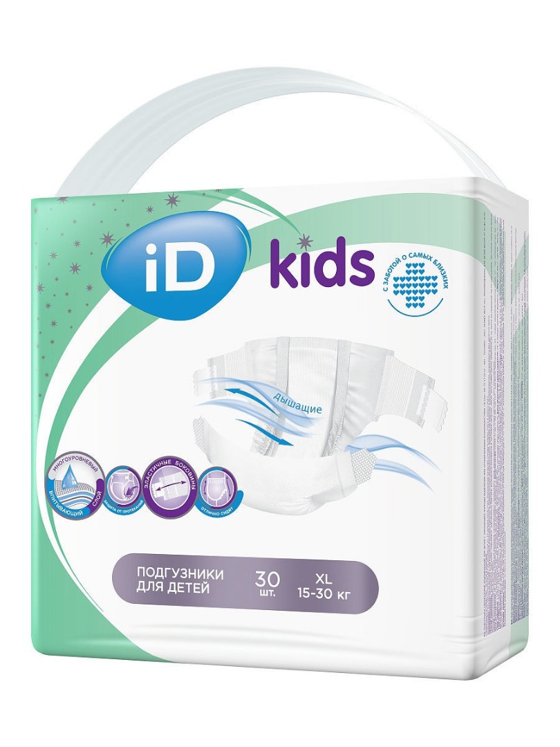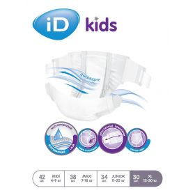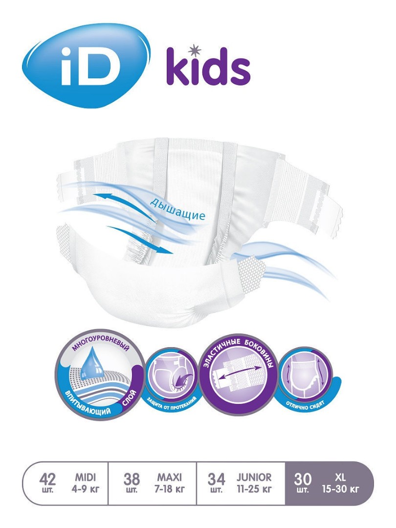 iD kids это специальные подгузники для ухода за детьми с нарушением функции выделения, ограниченными возможностями. ОСНОВНЫЕ ХАРАКТЕРИСТИКИ: 1. Многоуровневый впитывающий слой 2. Эластичные боковины 3. Мягкие материалы 4. Многоразовые застежки липучки 5. Без отдушек 6. Дерматологически протестированы 7. Являются изделием медицинского назначения.