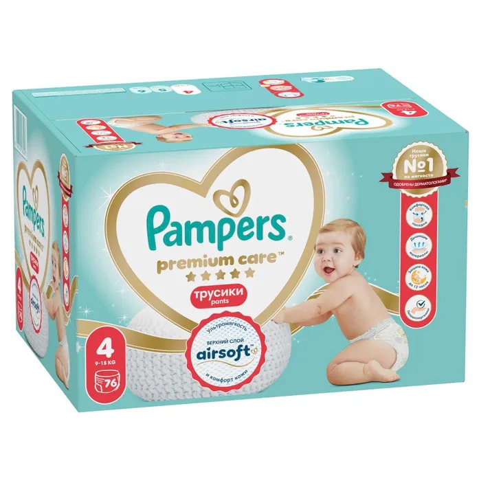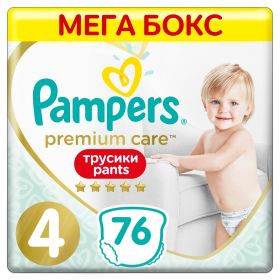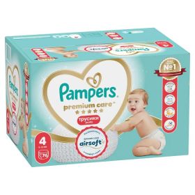 Подгузники трусики 4 размера Pampers Premium Care идеальны для мальчиков и девочек весом 9-15 кг (76 шт). Для комфорта и защиты кожи малыша используйте вместе с детскими влажными салфетками Pampers Harmonie Aqua, которые содержат органический хлопок и 99% чистой воды, поэтому подойдут даже для самой чувствительной кожи.